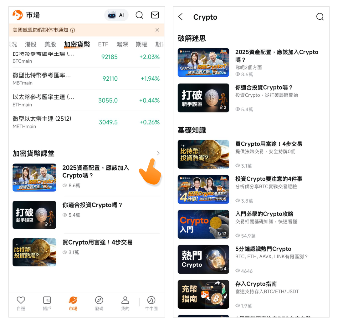 「加密貨幣」页的第五、六、七個子功能分別是加密貨幣概念股、加密貨幣期貨、加密貨幣課堂。您可在此處了解到更多加密貨幣概念股及一些相關課堂分享。若深入了解主題相關課堂,请点击「>」。「加密貨幣課堂」頁面會再細分「破解迷思」、「基礎知識」及「分析方法」三