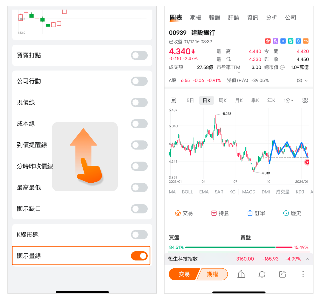 路徑:個股頁>圖表>菜單圖標>圖表標註>顯示畫線。