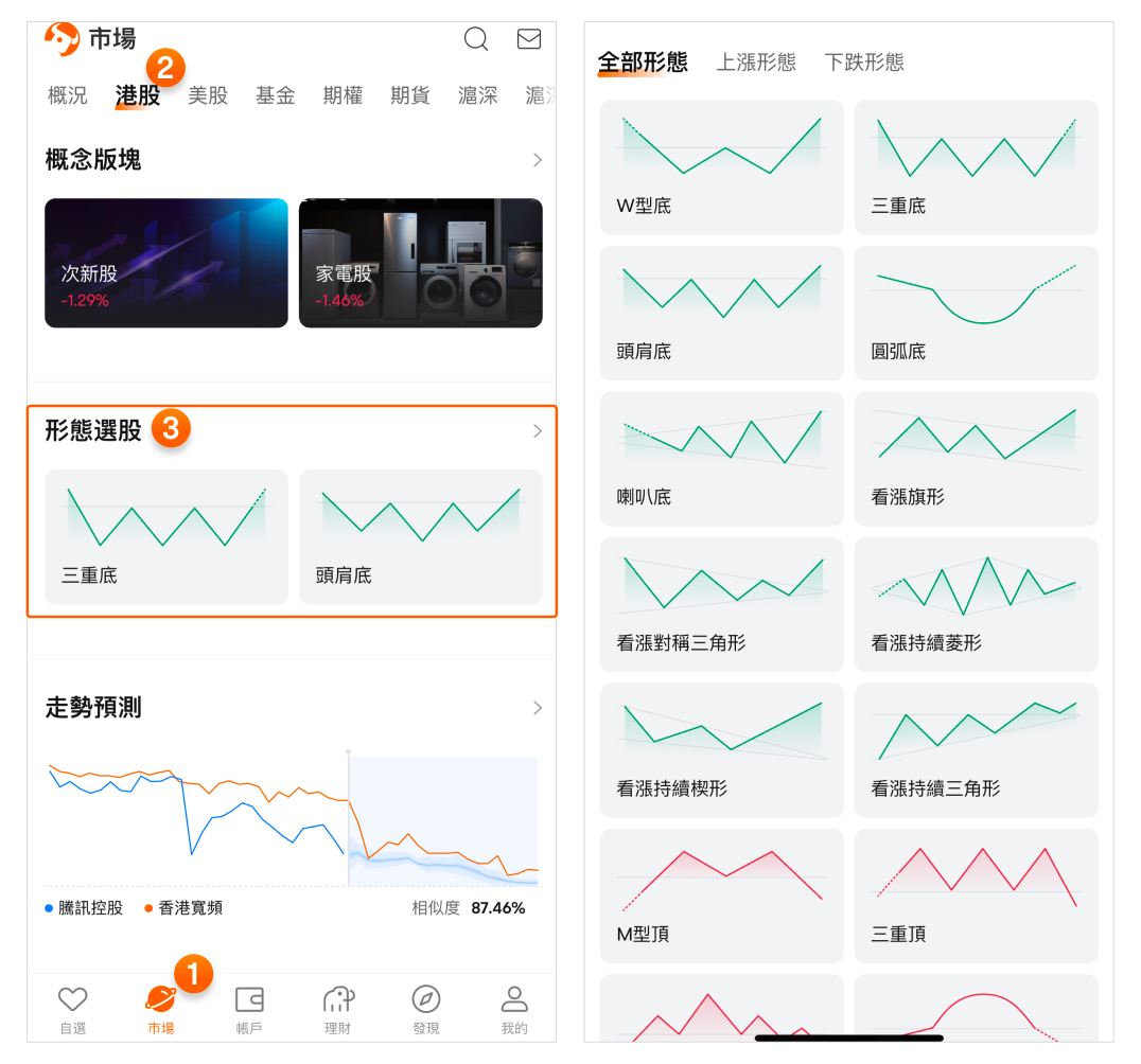 除上述的三重頂形態外,您亦可以通過市場頁>港股/美股>形態選股功能,獲取更多K線形態信息作为投资参考。
