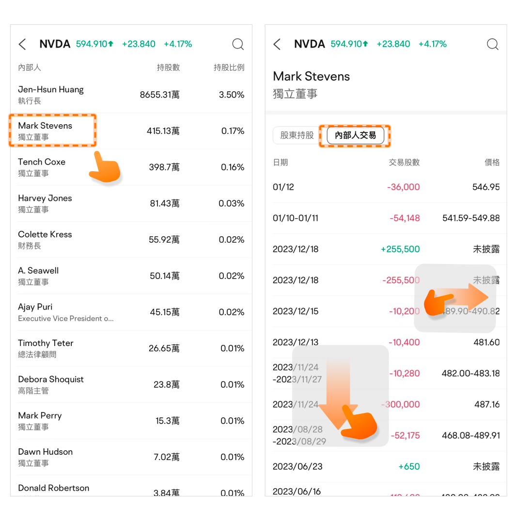 下滑,妳可以了解,按照時間倒序排序的內部人交易詳情卡片。點擊任意一張卡片,妳可以了解他的職位信息、交易日期、交易股數、價格以及交易的類型、證券類型,以及交易後的持股數。