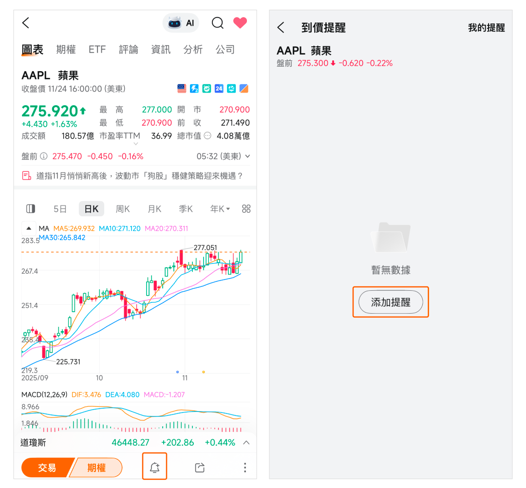 到價提醒功能,可以幫助您監控股票價格的變化,並在股票價格或異動達到您設定的提醒值時,自動向發送提醒信息,以便您及時做出相應的交易決策。目前app端支持的提醒類型有:到價提醒(漲勢、跌勢)、盤口提醒、指標提醒、期權、事件共6種。 如何在富途牛牛設置到價提醒?