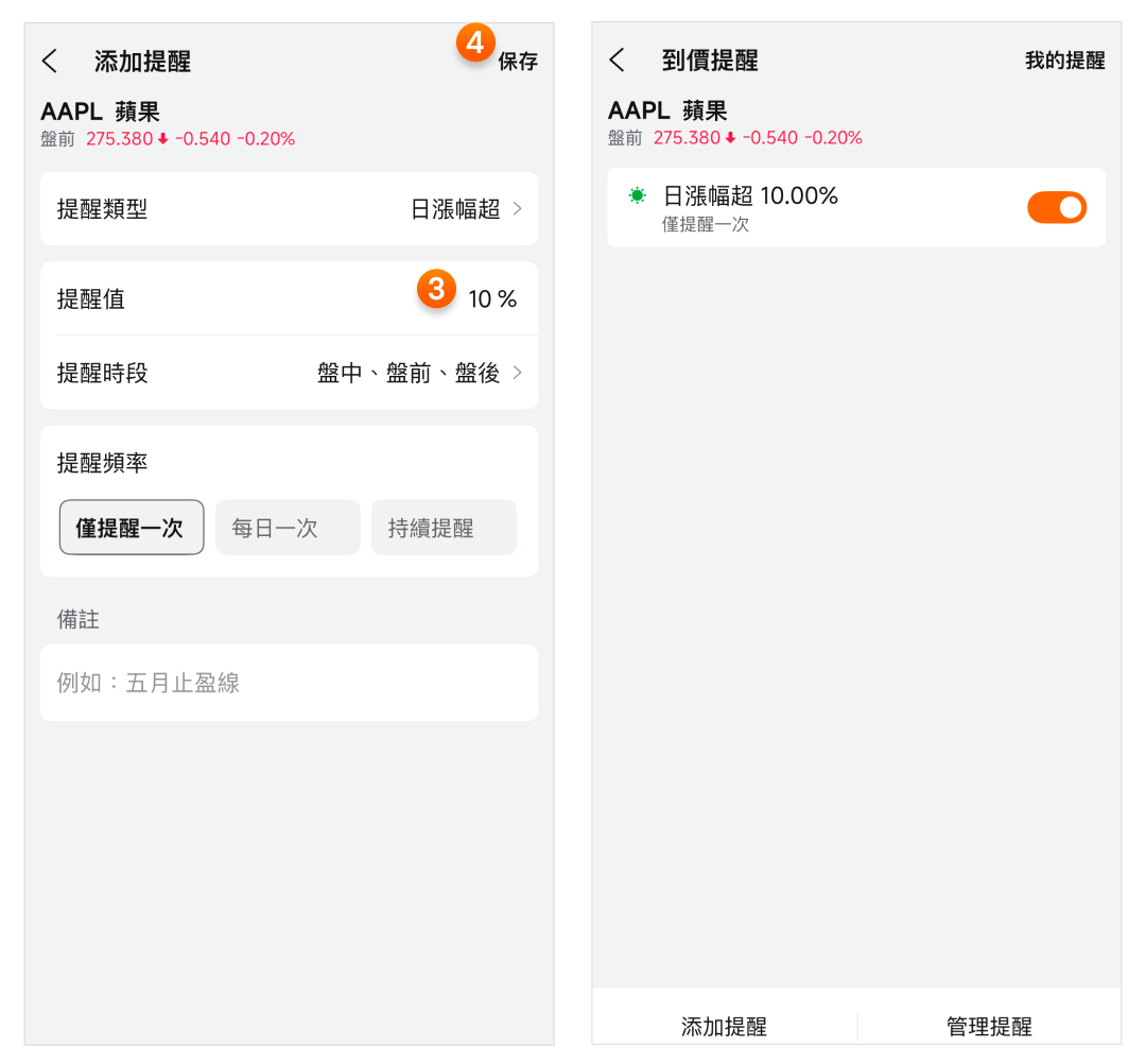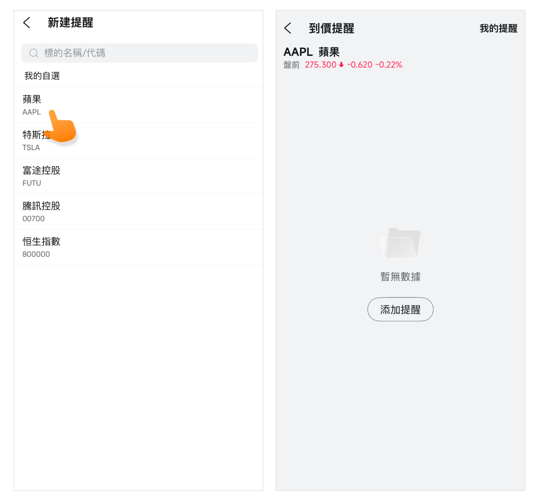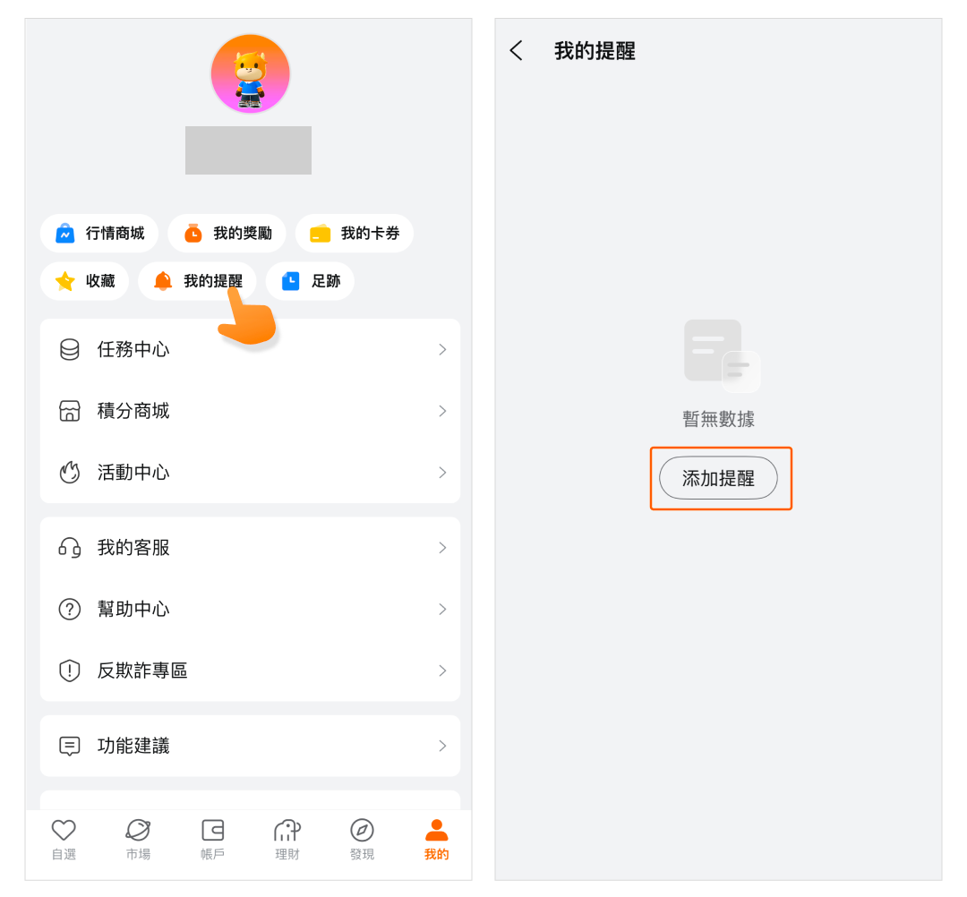 路徑2:我的頁>我的提醒,点击「新建」,搜索个股名称或直接從添加提醒。