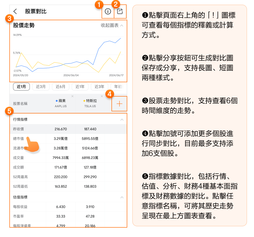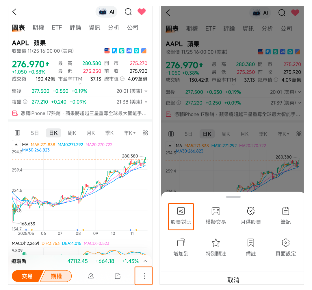 路徑:個股頁 > 底部「┆」圖標 > 股票對比。