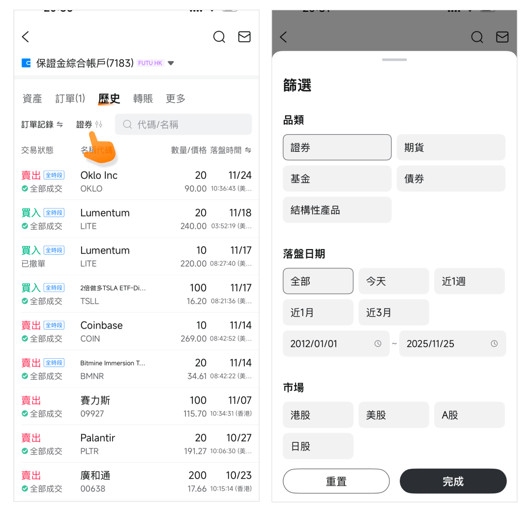 點擊「訂單記錄」右側的篩選按鈕,您還可自由選擇品類、落盤日期、市場等信息。
