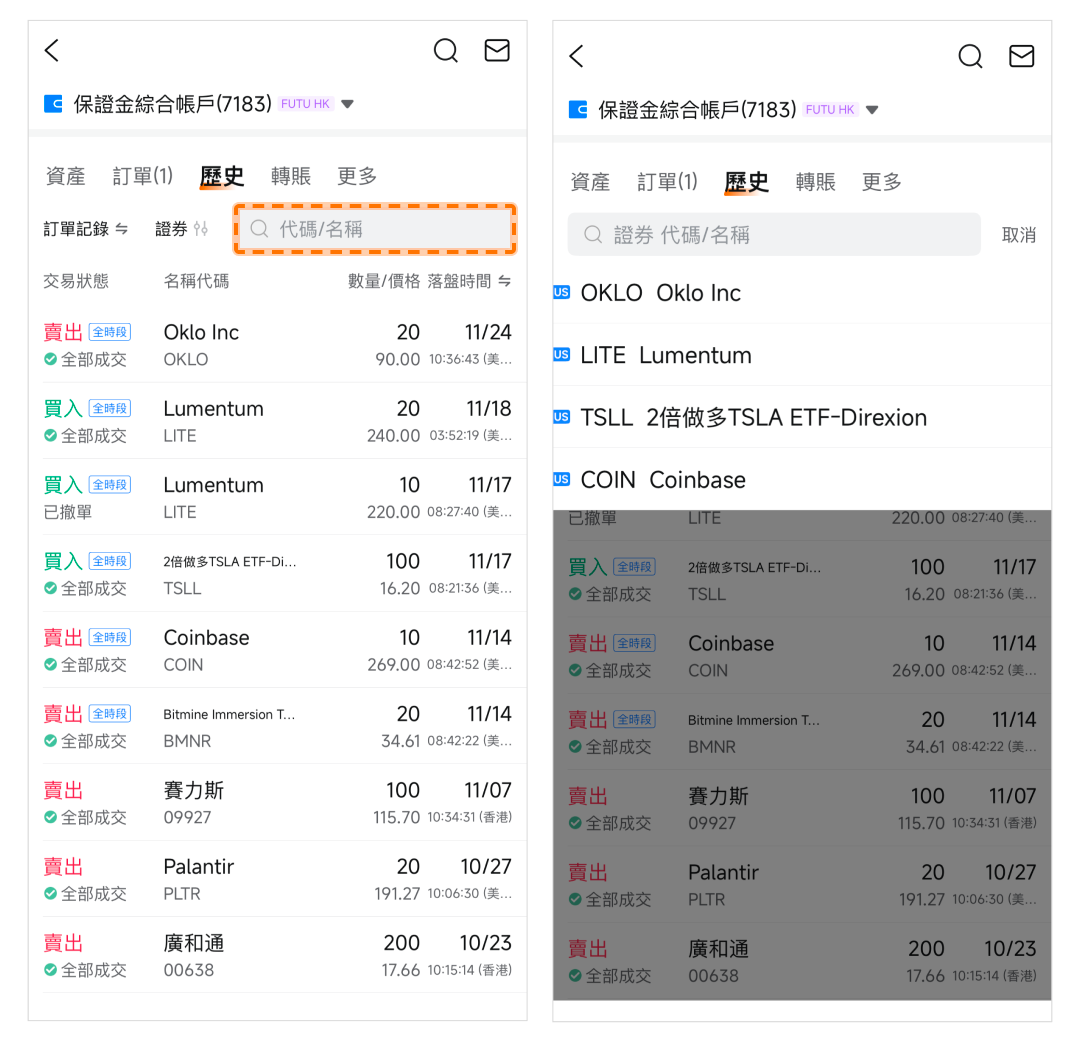 通過點擊「搜索」欄,您還可直接輸入您想查找的帳戶代碼/名稱。