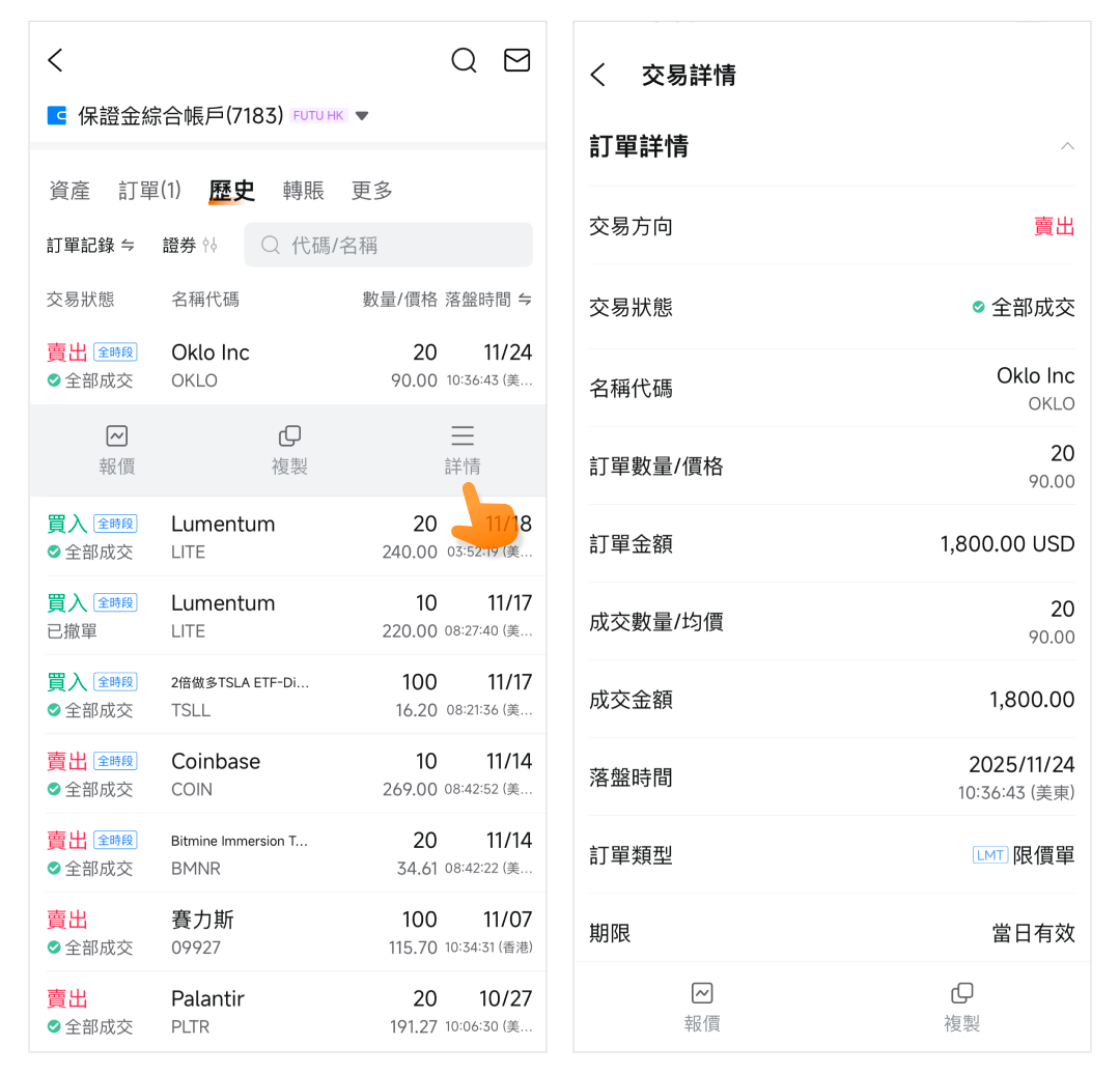 通過點擊「詳情」,您將直接進入交易詳情頁。