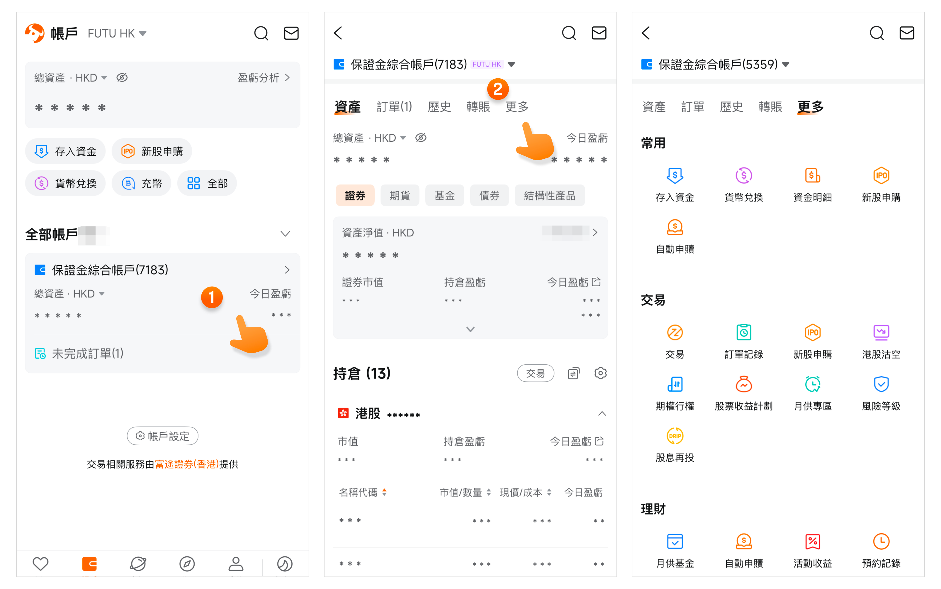 該欄由10個模塊組成:常用、交易、理財、資金、股票、帳戶、費用、公司行動、費用、設置。您可以在此處對您當前帳戶進行任意相關操作,幫您的資產進行更好的管理。
